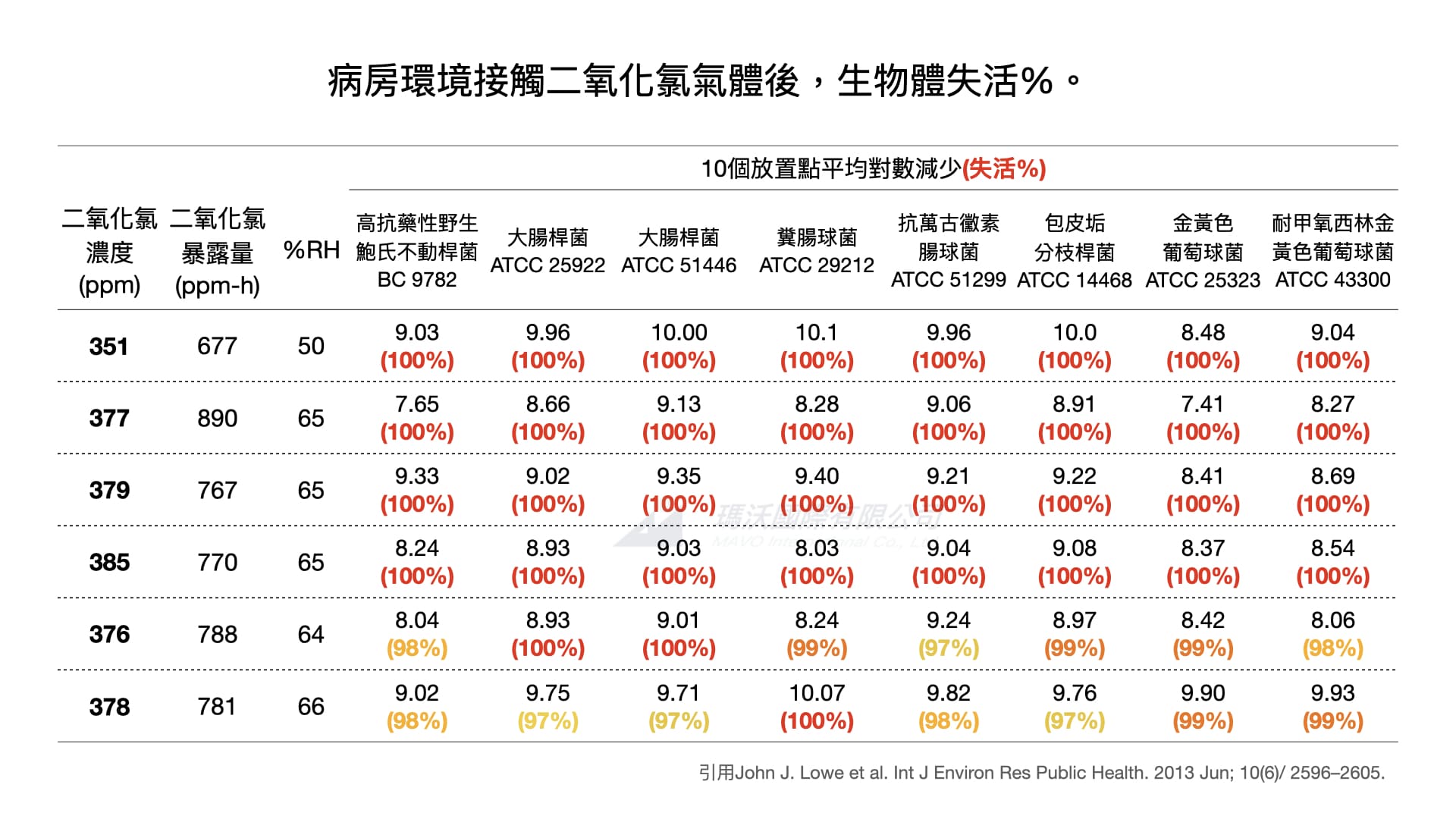 ClO2濃度為351 ppm至385 ppm,在病房裡維持<3小時,對實驗區外的區域沒有影響。